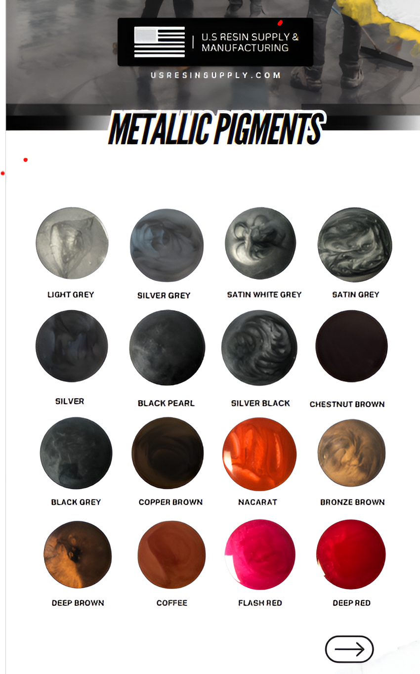 The Metallic Color Chart from US Resin Supply reveals a stunning palette of luxurious, shimmering tones designed to elevate your resin projects.